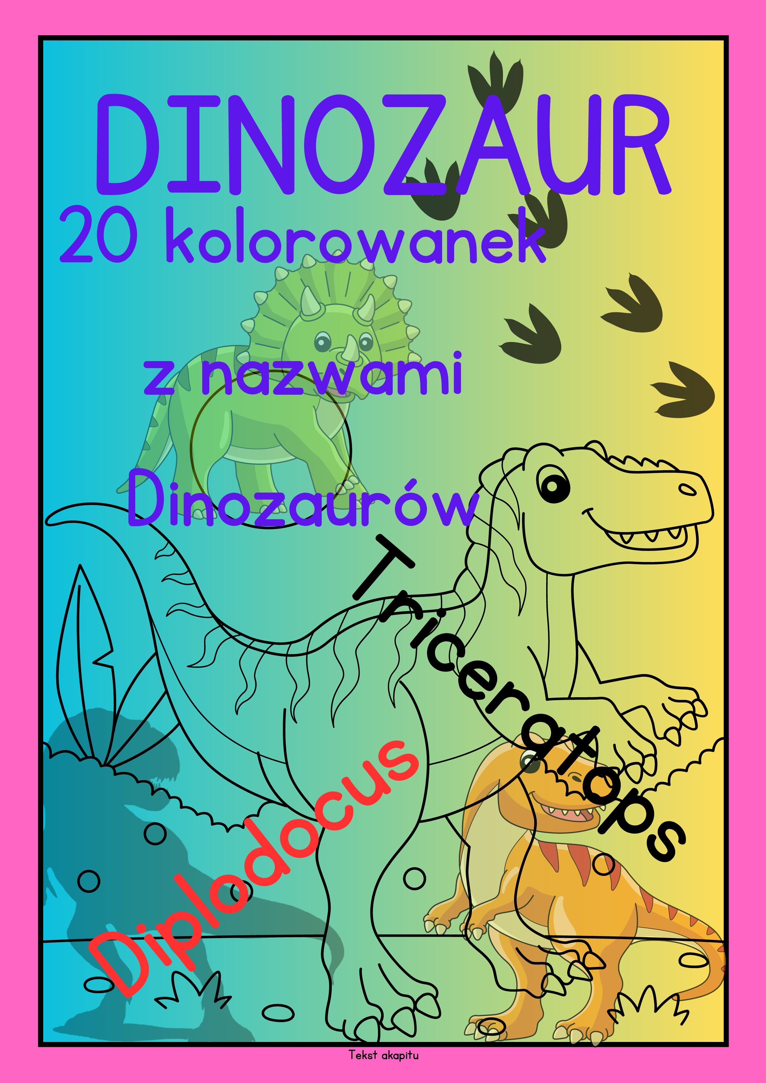 20 stron i 20 kolorowanek z nazwami Dinozaurów.Pobudzanie kreatywności,ćwiczenie koncentracji i cierpliwości,nauka rozpoznawania i redukcja stresu.