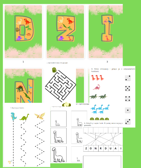 Dinozaury Girlanda, + 12 zadań Wycinanie, rysowanie po śladzie, kolorowanka, ułóż od najmniejszego do największego, labirynt, pisanie, rysowanie, przeliczanie, porównywanie, SUDOKU
