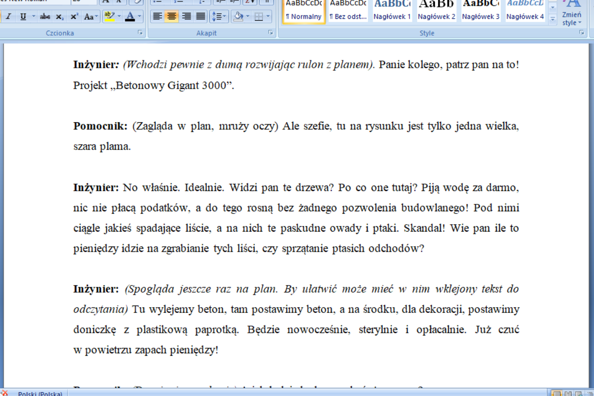 Humorystyczna alternatywa dla uczniów szkoły podstawowej, która może zostać wykorzystana na dowolnej uroczystości, której tematem przewodnim jest ochrona środowiska, czy też ekologia. Sprawdzi się zarówno podczas występu z okazji Dnia Ziemi, jak i Pierwszego Dnia Wiosny.