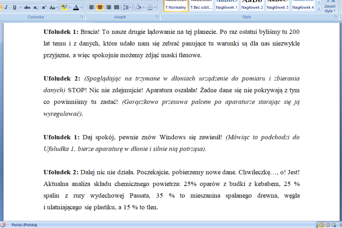 Przedstawienie jest wstępnie rozpisane dla 12 osób (5 ufoludków, influencerka, inżynier, pomocnik, matka, syn, 2 narratorów), jednak ilość zaangażowanych osób można dowolnie modyfikować dzieląc role narratorów, lub łącząc role ufoludków. Spora część tekstu może być przez uczniów odczytywana, co pomoże przy organizacji przedstawienia z grupami, które nie czują się na scenie niczym przysłowiowa „ryba w wodzie”.