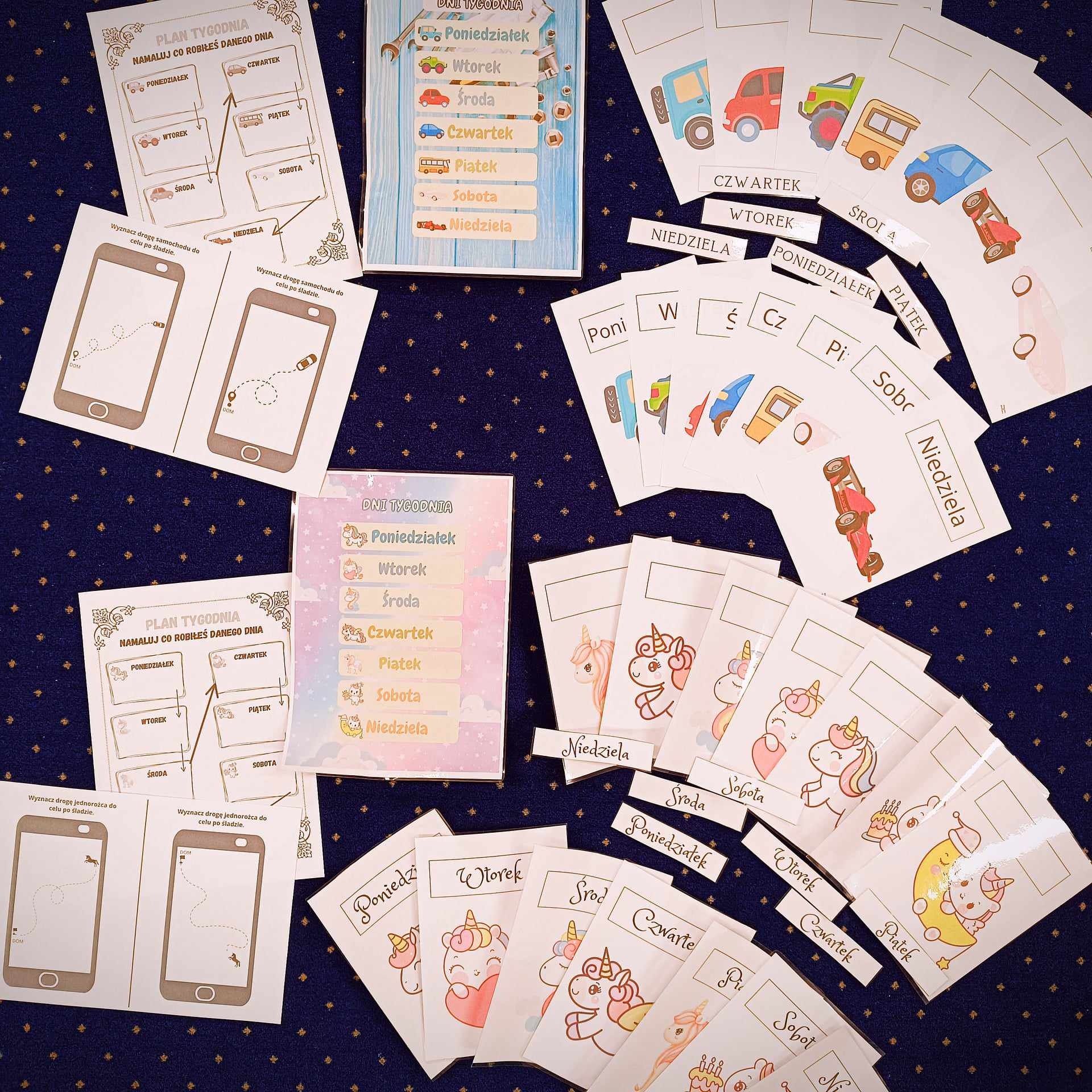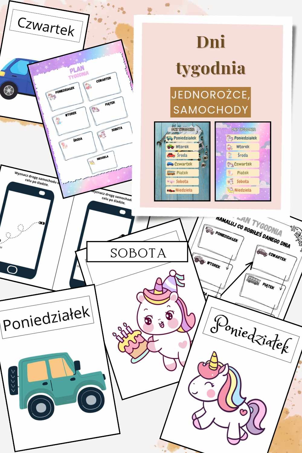 Materiał w wersji pdf., stron 38, A4, zawiera: - strony z jednorożcami, które nazywają się: poniedziałek, wtorek, środa.... - strony z ilustracjami jednorożców do uzupełnienia nazw ich imion - strony z samochodami, które nazywają się: poniedziałek, wtorek, środa.... - strony z ilustracjami samochodów do uzupełnienia nazw ich imion - karty pracy - planer tygodnia - napisy dni tygodnia do wycięcia - wypisane dni tygodnia w formie plakatu A4, który można wykorzystać do oznaczania danego dnia np. za pomocą klamerki, magnesu (na tablicy magnetycznej). Przedszkolny WszechŚwiatBrak recenzji