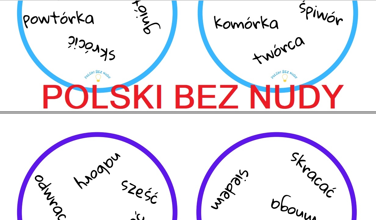 Zestaw kart do gry Dobble "ó" wymienne - zawiera karty z wyrazami zawierającymi "ó" oraz karty z wyrazami, gdzie "ó" wymieniło się na "o, a, e". Dołączona jest też instrukcja z różnymi wariantami gry.