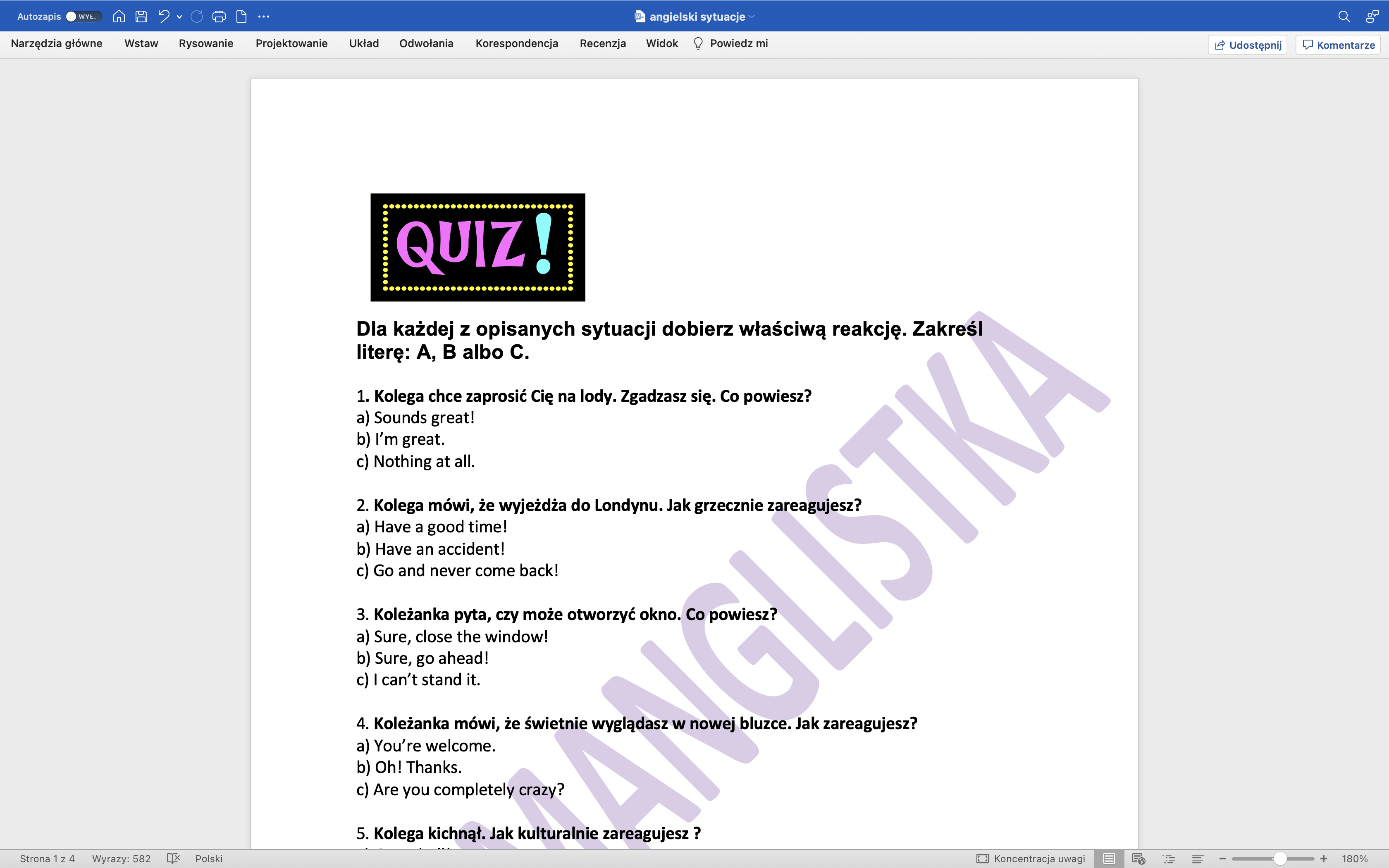 Dobieranie reakcji do sytuacji- nowy króciutki quiz+ KLUCZ