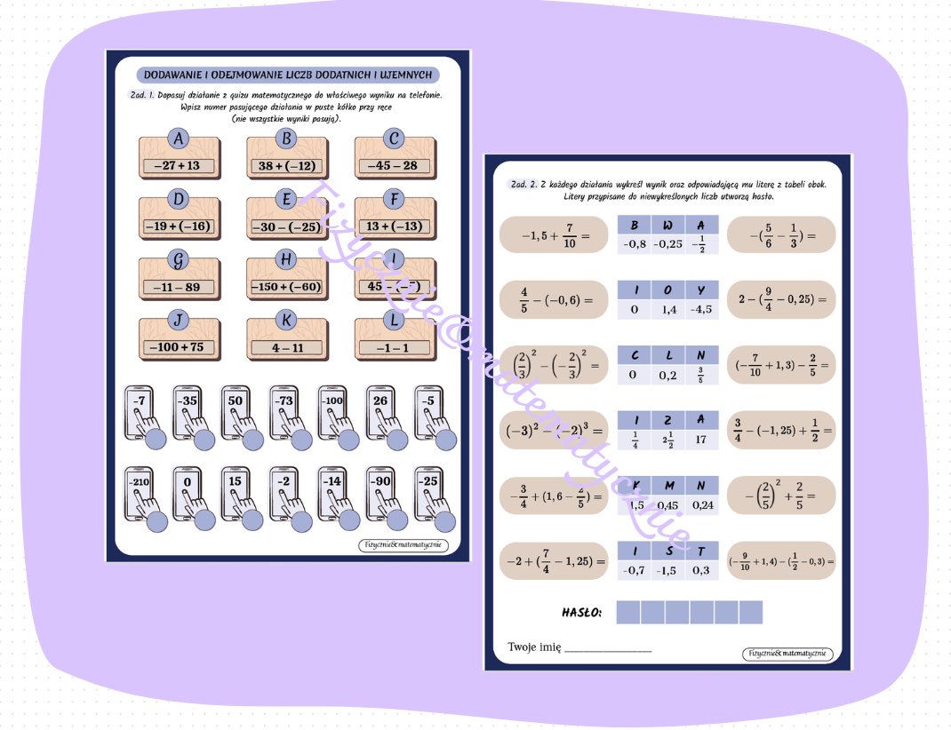 Materiał zawiera zadania sprawdzające umiejętność dodawania i odejmowania liczb dodatnich i ujemnych (liczby całkowite i ułamki). Może być wykorzystany jako kartkówka lub karta pracy. Załączyłam poprawne rozwiązania. Grafika została wykonana za pomocą platformy canva.com.