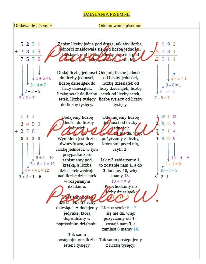 DODAWANIE i ODEJMOWANIE PISEMNE - plakat, kl. 4, kl. 5, kl. 6, kl.7