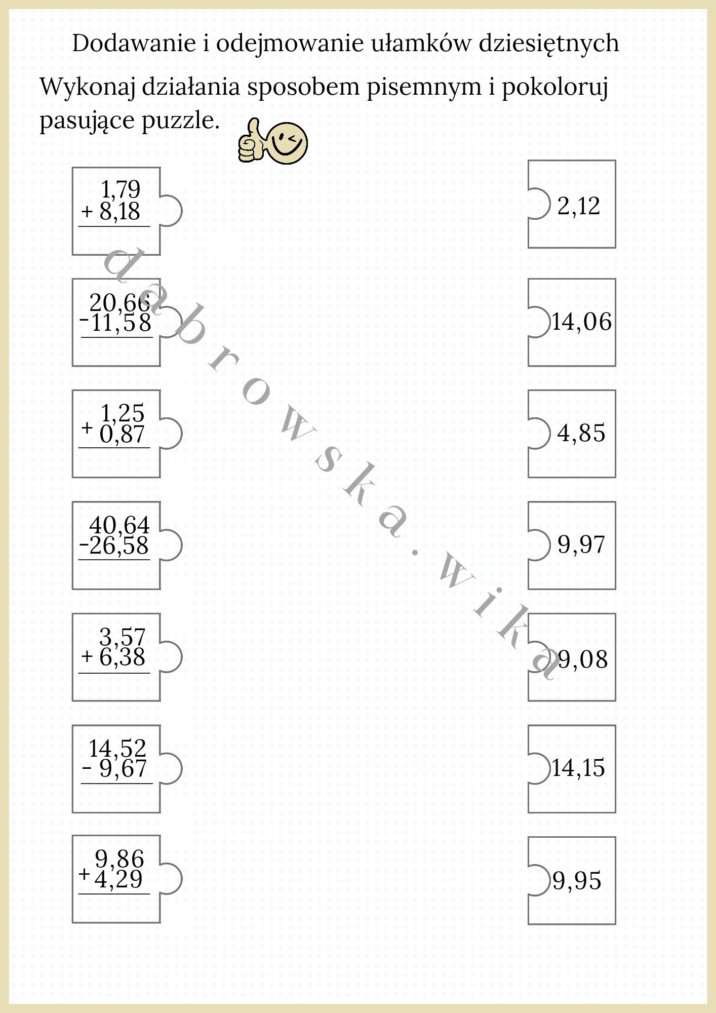 Zadaniem ucznia jest wykonanie pisemnie działań, a następnie odszukanie wyniku i pomalowanie odpowiedniego puzzla.