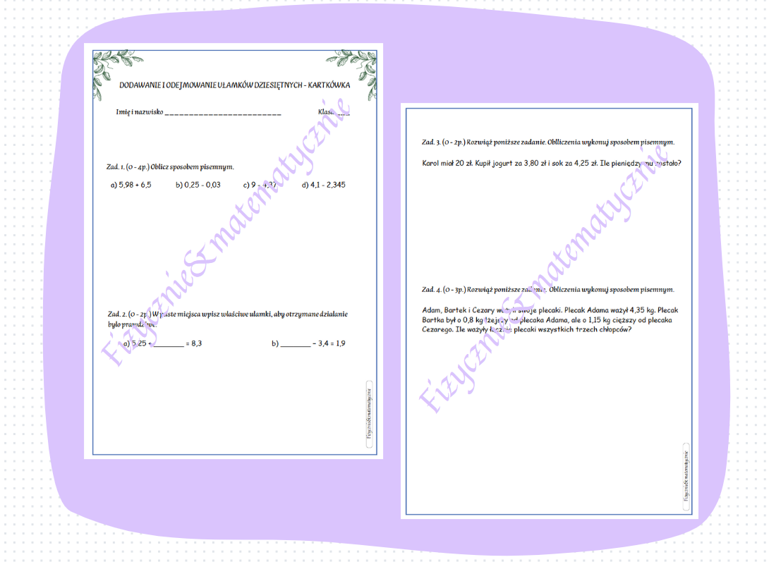 Materiał zawiera zadania sprawdzające umiejętność pisemnego dodawania i odejmowania ułamków dziesiętnych. Może być wykorzystany jako kartkówka lub karta pracy.