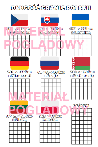 Karta pracy pod tytułem "Długość granic Polski". Uczniowie ćwiczą dodawanie sposobem pisemnym i dowiadują się ciekawostek.