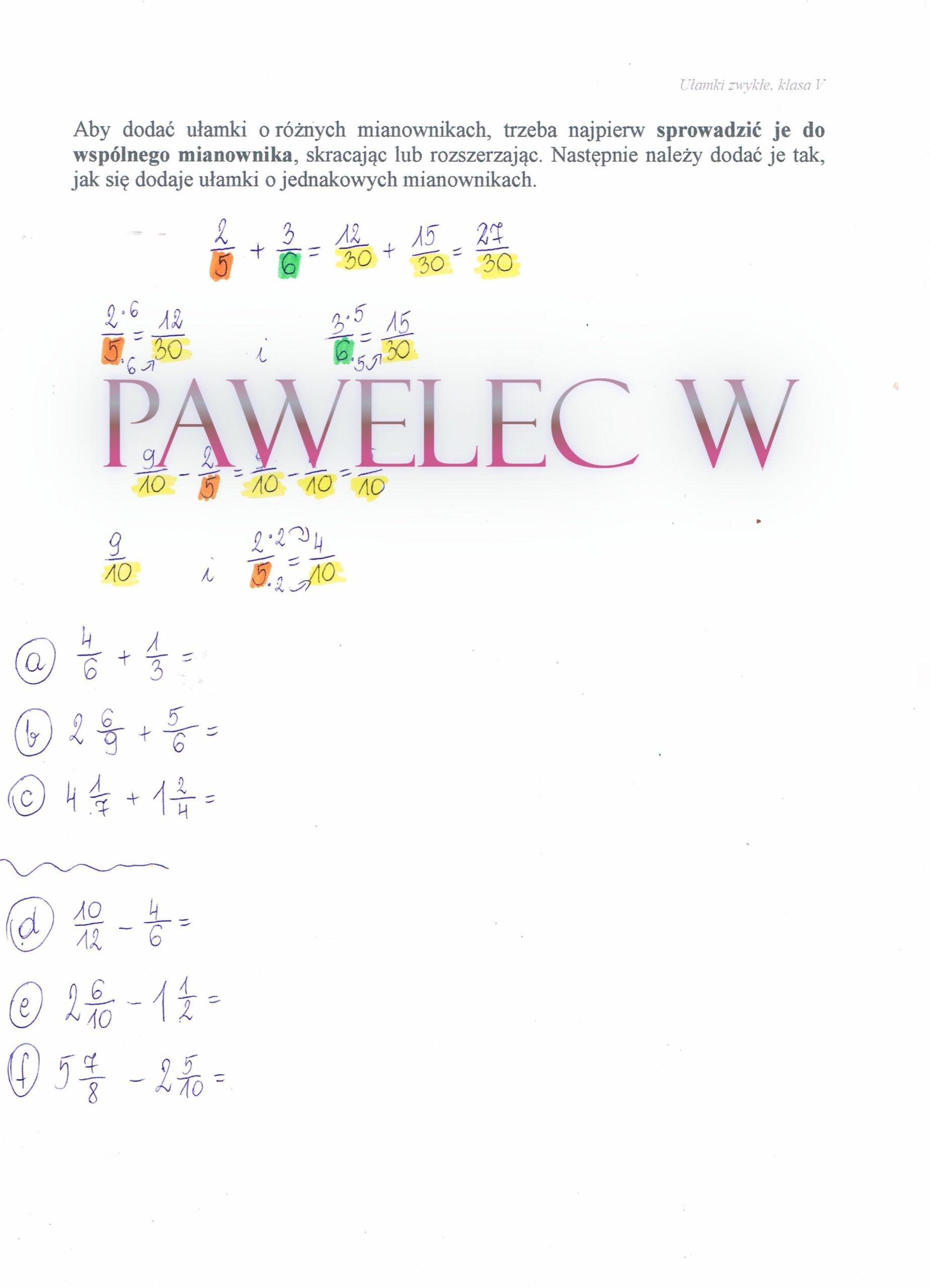 Plakat/karta pracy, która pomoże w szybki sposób wytłumaczyć i przećwiczyć dodawanie ułamków zwykłych,