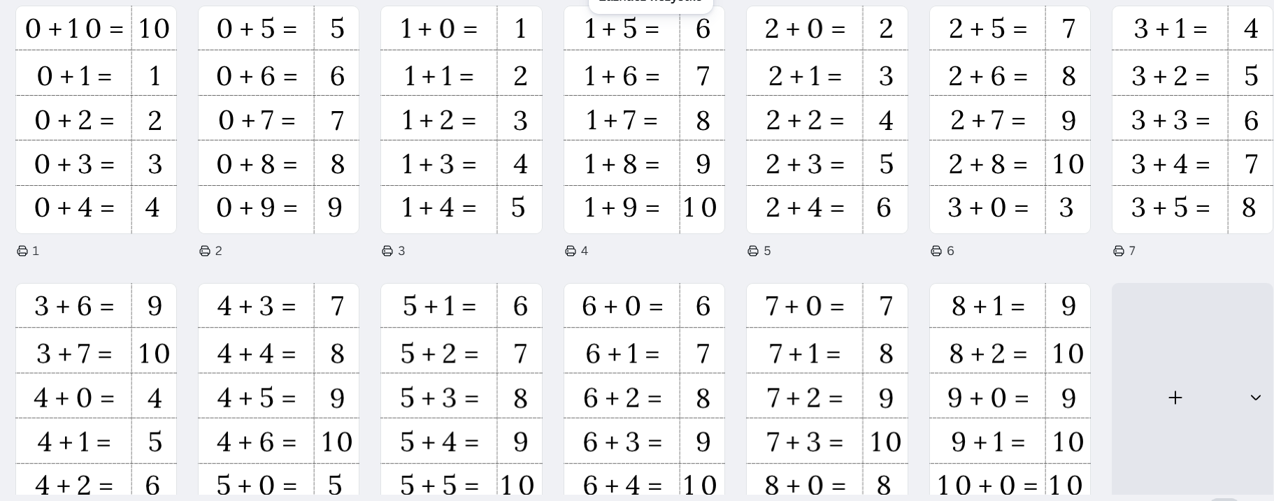 Dodawanie w zakresie 10 - fiszki do nauki można odciąć i dopasować wyniki