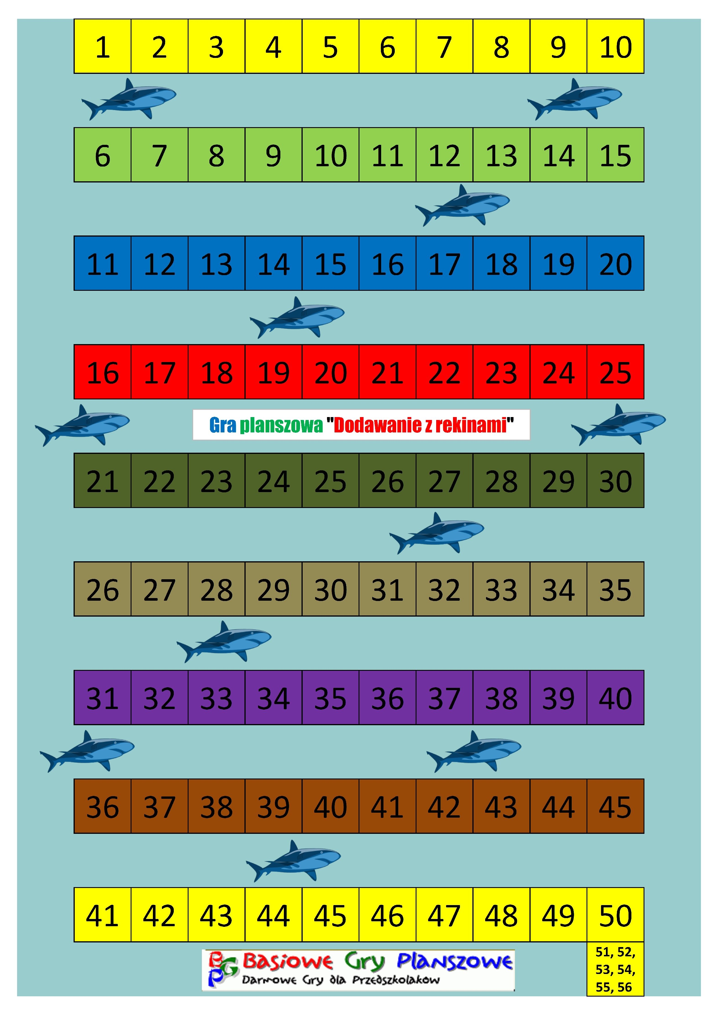 Dodawanie z rekinami to gra dla kilku graczy. Celem gry jest ćwiczenie dodawania w zakresie 50, ale także ćwiczenie zwrotów grzecznościowych.