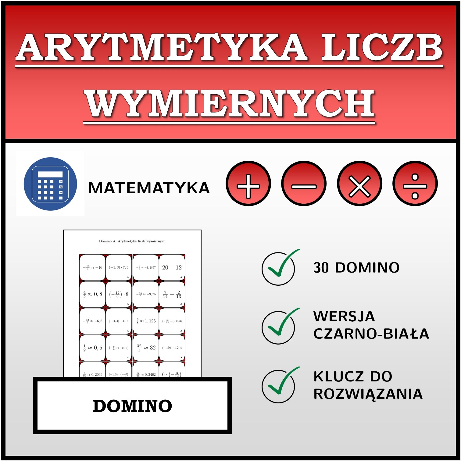 W materiale znajduje się łącznie 30 różnych zestawów domina na temat arytmetyka liczb wymiernych w następującym układzie:
