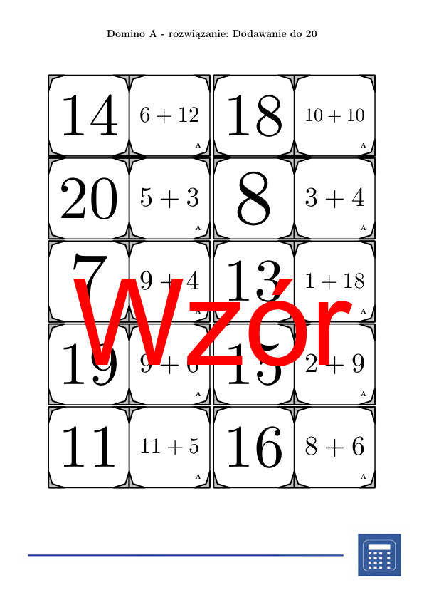 W materiale znajduje się łącznie 30 różnych zestawów domina na temat dodawanie do 20 w następującym układzie: