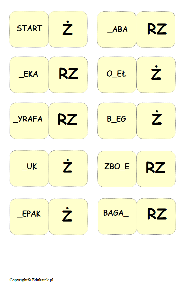 W skład zestawu wchodzą 3 gry (u-ó, h-ch, ż-rz). W ramach każdej gry jest 30 kart do samodzielnego wydrukowania. Razem jest 90 kart (kartoników).