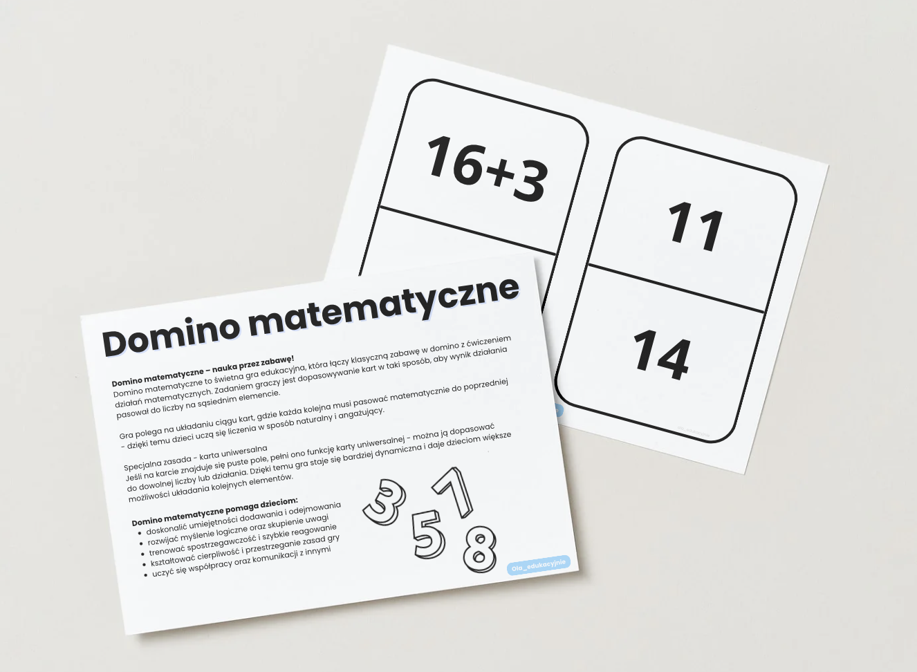 W zestawie znajduje się również karta uniwersalna (puste pole), którą można dopasować do dowolnej liczby lub działania, co uatrakcyjnia rozgrywkę i daje więcej możliwości układania.