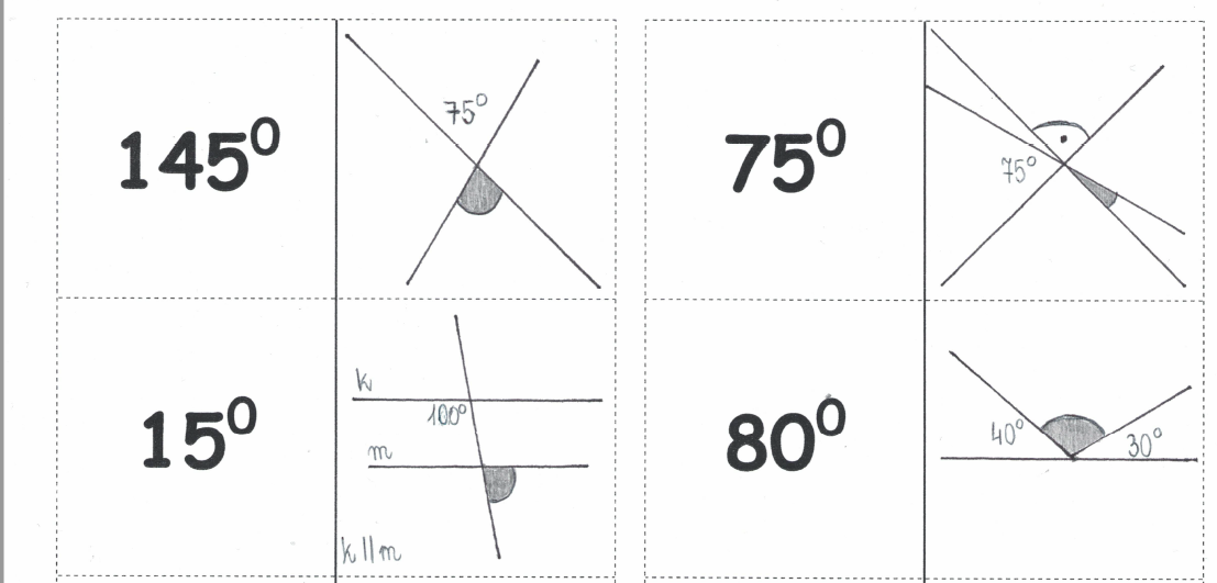 Gra „Domino matematyczne – Kąty wierzchołkowe, przyległe, naprzemianległe i odpowiadające” powstała z myślą o aktywnym ćwiczeniu tego zagadnienia matematycznego w klasie piątej. Może służyć jako forma zaliczeniowa podanego zakresu materiału. Myślę, że dla uczniów starszych klas będzie ciekawą formą przypomnienia zagadnienia. Przygotowany przeze mnie zestaw kamieni domina można wykorzystać do pracy indywidualnej, ale także w tradycyjnej formie gry towarzyskiej. Zapewne znajdą Państwo również inne pomysły na wykorzystanie domina. Życzę udanej zabawy i owocnej nauki :)