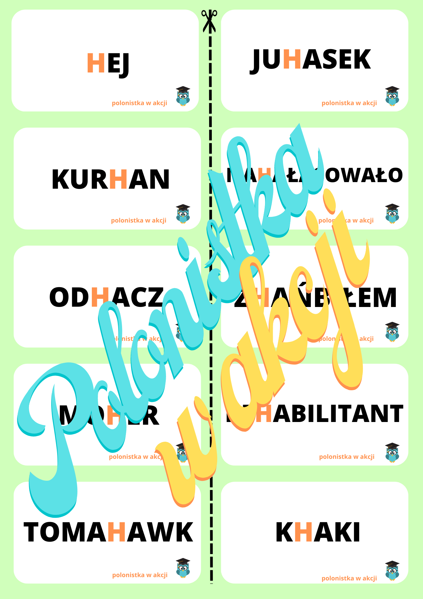 Zestaw zawiera: 1 kartę tytułową (należy wydrukować ją 4 razy lub wcale) oraz 4 kartki z 10 wyrazami z ,,h”. Gra przeznaczona dla grupy od 3 do 5 osób. Można połączyć z nauka pracy ze słownikiem - wiele słów z zestawu może być dla uczniów nowych.