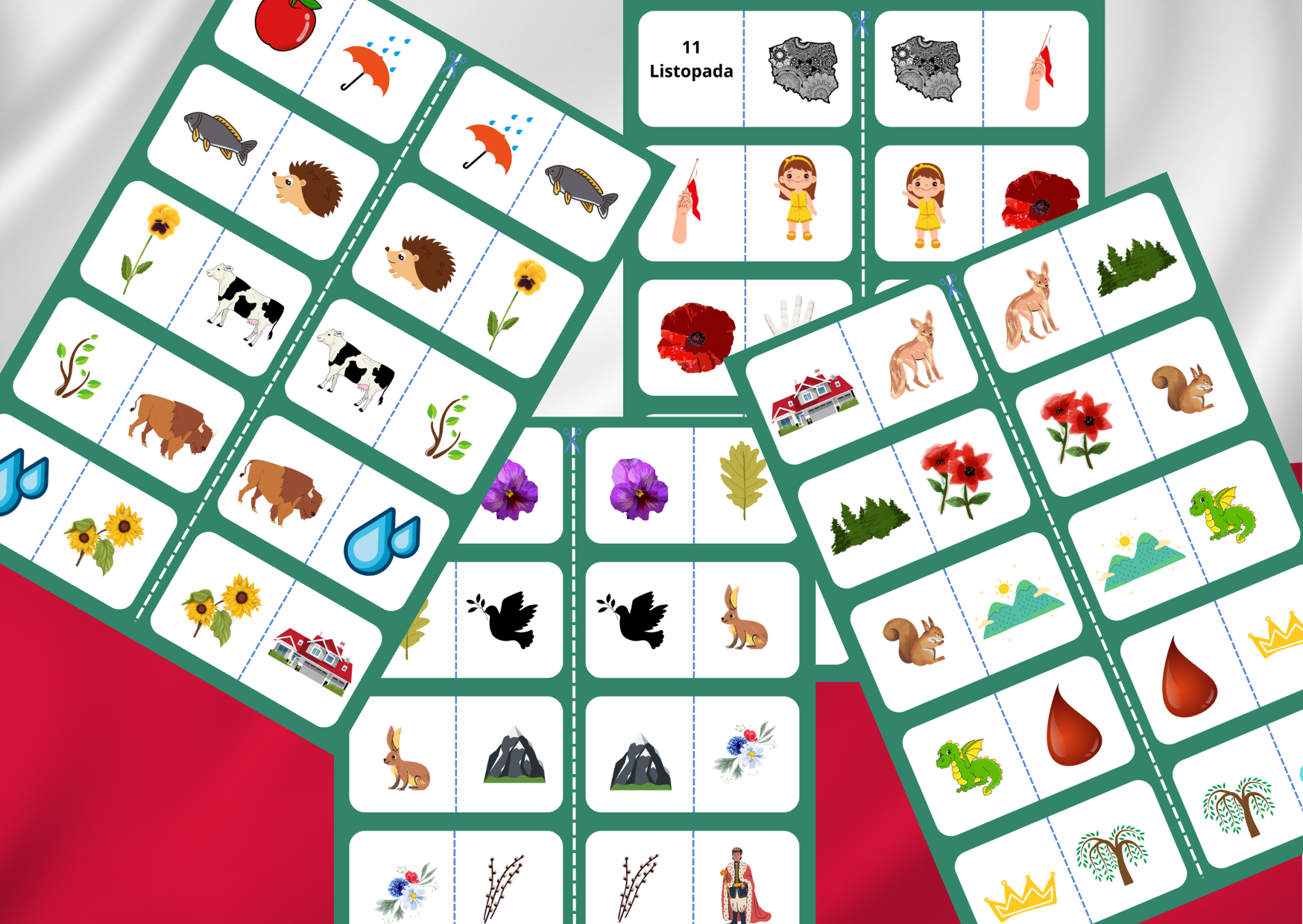 Zestaw „Domino patriotyczne - 11 listopada" – obrazki związane ze Świętem Niepodległości i Polską,  zawiera 6 kart po 10 karteczek domina.