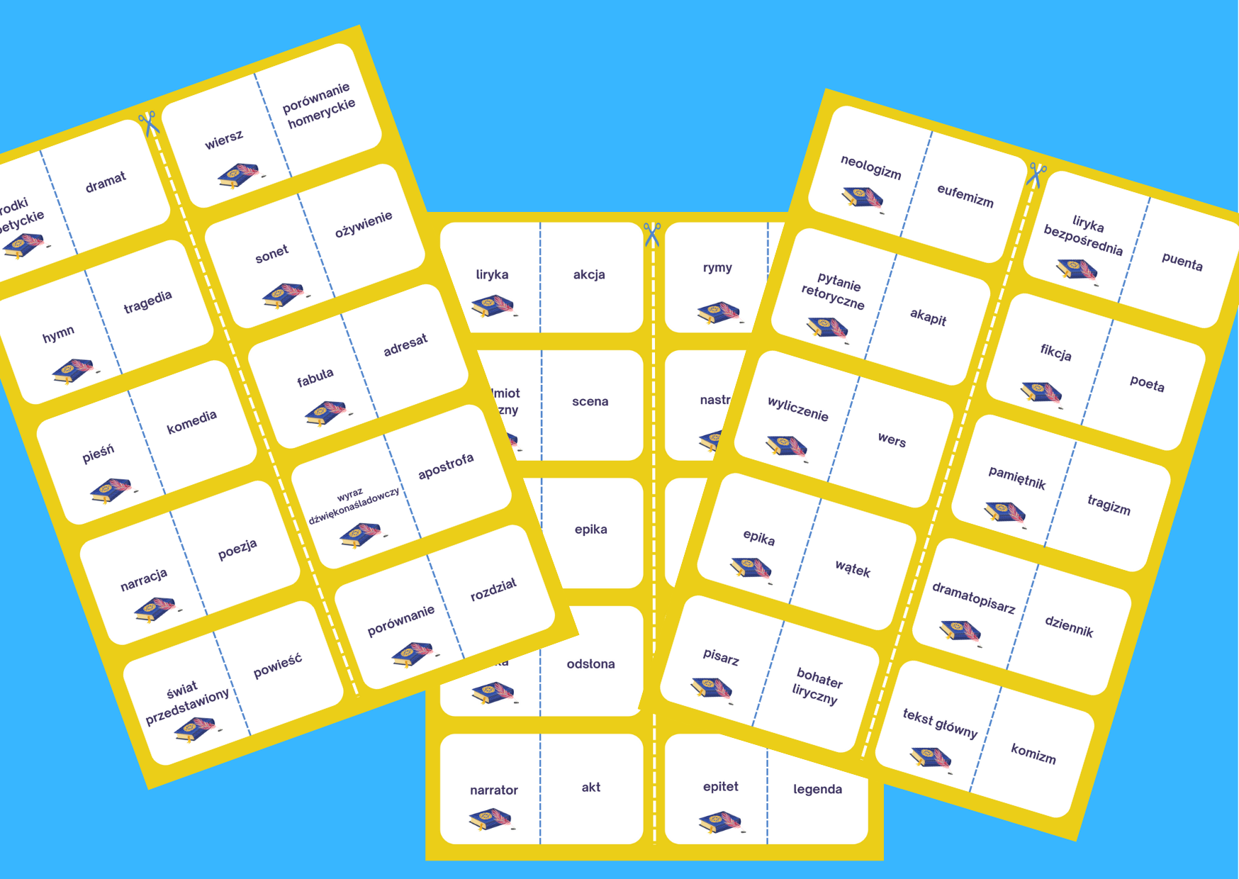 Zestaw „Domino – rodzaje i gatunki literackie - kl.7-8 – powtórzenie” zawiera 5 kart po 10 karteczek domina. Materiał dotyczy teorii literatury: rodzaje i gatunki literackie, terminy, tytuły lektur.