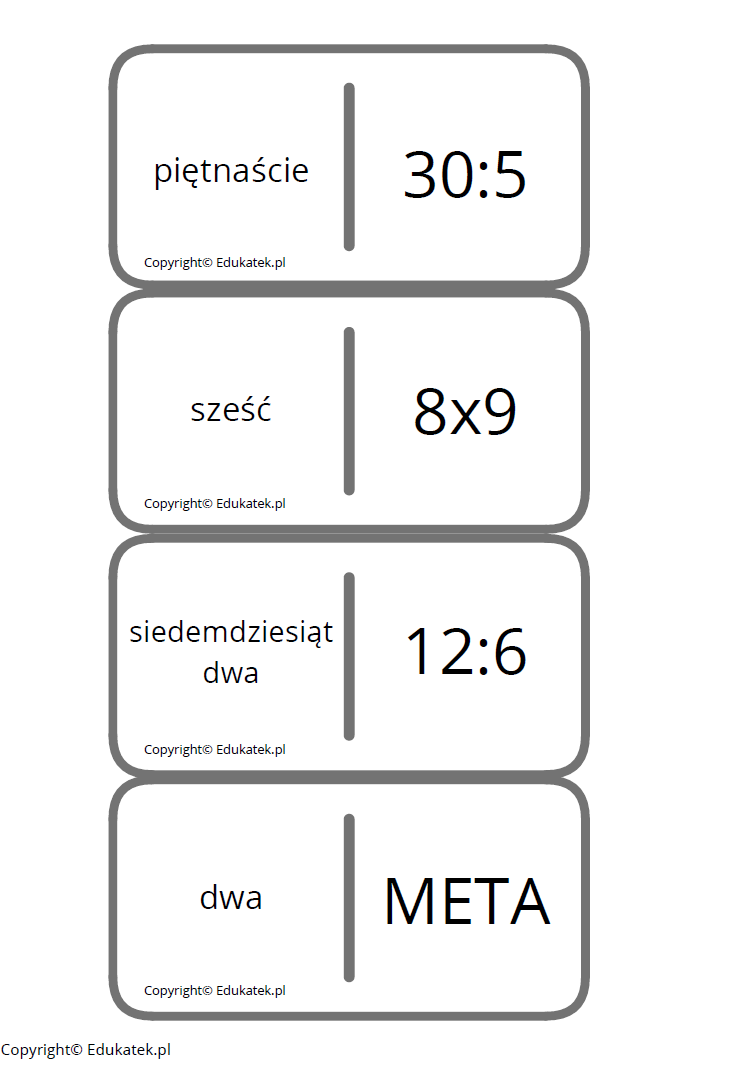 Zabawa matematyczna - zestaw elementów umożliwiający doskonalenie tabliczki mnożenia i dzielenia w zakresie 30, 50, 100.