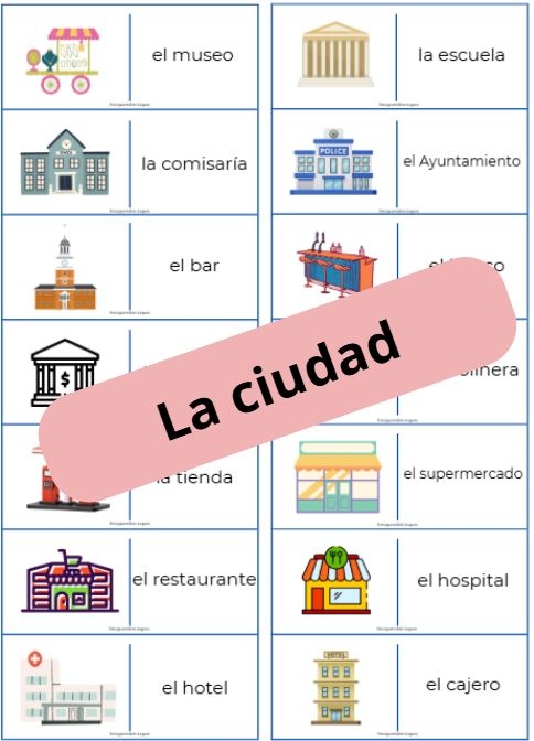 24 karty domino z obrazkami i hiszpańskimi słówkami dotyczącymi miasta
