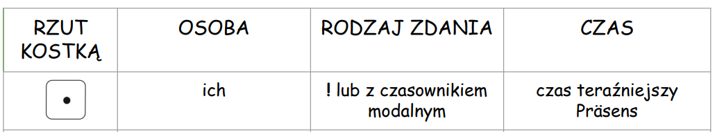 Materiał zawiera 26 zwrotów (np. Fragen stellen, ans Meer mit dem Bus fahren). Uczniowie (indywidualnie, w parach lub małych grupach) układają domino, a po wykonaniu zadania mogą tworzyć zdania z tych zwrotów dla różnych osób, w różnych czasach, w różnych trybach (potrzebujemy jednej kości do gry - tabelka dodatkowo do wydrukowania).