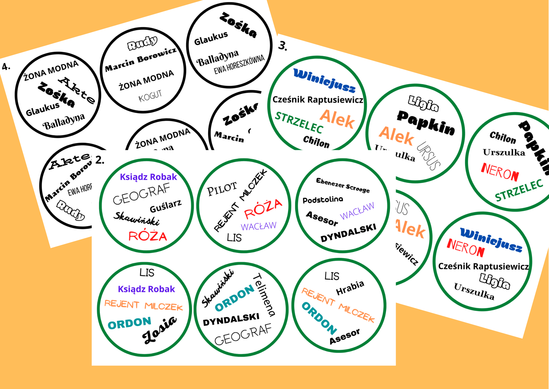 Zestaw zawiera 5 kart w wersji czarno-białej i 5 kart w wersji kolorowej. Na każdej karcie znajduje się 6 kół z bohaterami lektur z klas 7-8. Po wycięciu materiał można zalaminować, aby dłużej służył.