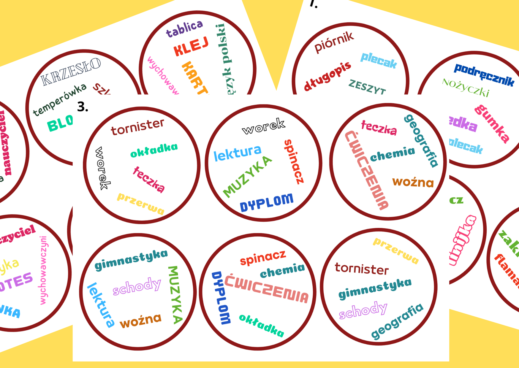 Zestaw zawiera 6 kart w wersji kolorowej. Na każdej karcie znajduje się 6 kół z wyrazami kojarzącymi się ze szkołą. Po wycięciu materiał można zalaminować, aby dłużej służył.