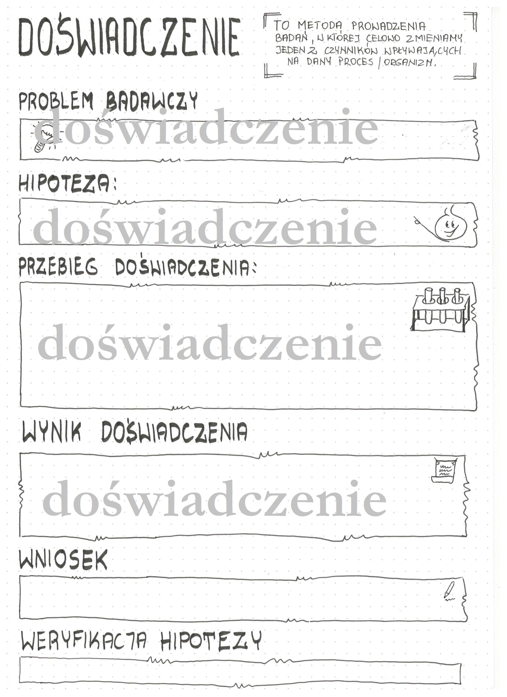 Karta pracy, którą można wykorzystać do każdego doświadczenia. Uczeń samodzielnie zapisuje problem badawczy, formułuje hipotezę, zapisuje przebieg doświadczenia, notuje wyniki, zapisuje wnioski oraz potwierdza lub odrzuca poprawność hipotezy. Karta pracy dla klas 4-8 a nawet szkół ponadpodstawowych. Zakupiona karta oczywiście bez szarych napisów!