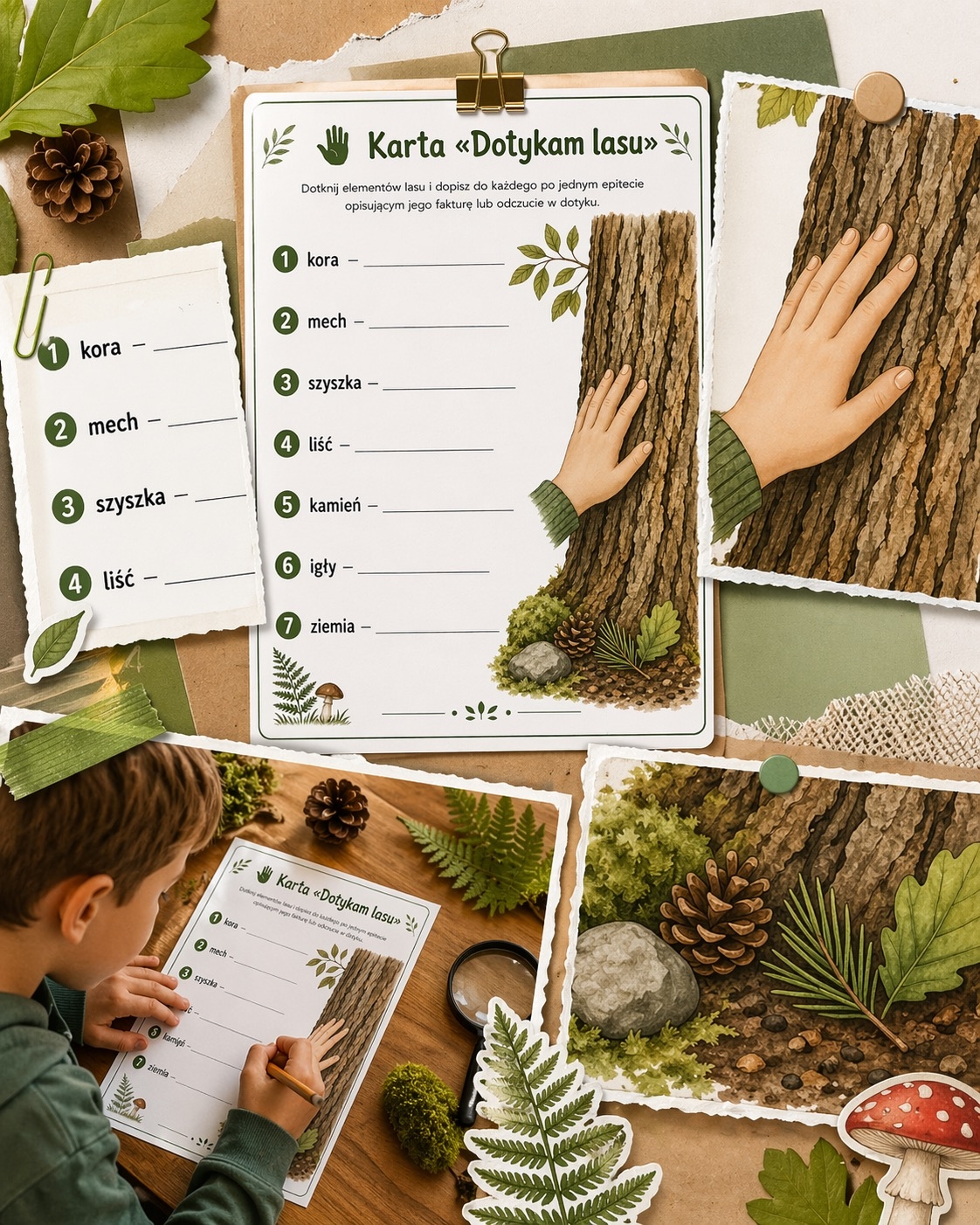 las, karta pracy, dotykam lasu, edukacja przyrodnicza, edukacja wczesnoszkolna, język polski, epitety, przymiotniki, opis przyrody, zmysły, zmysł dotyku, zajęcia sensoryczne, leśne aktywności, spacer po lesie, lekcja w terenie, przyroda, jesień, materiały dla nauczycieli, szkoła podstawowa, klasy 1-3, karta A4, rozwijanie słownictwa, obserwacja przyrody, faktury, kora, mech, szyszka, liść, kamień, igły, ziemia 🌿