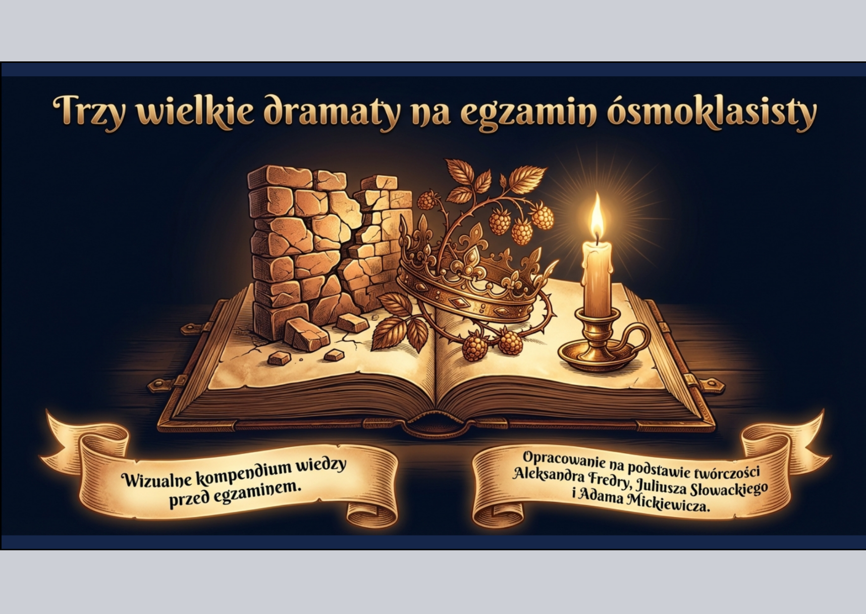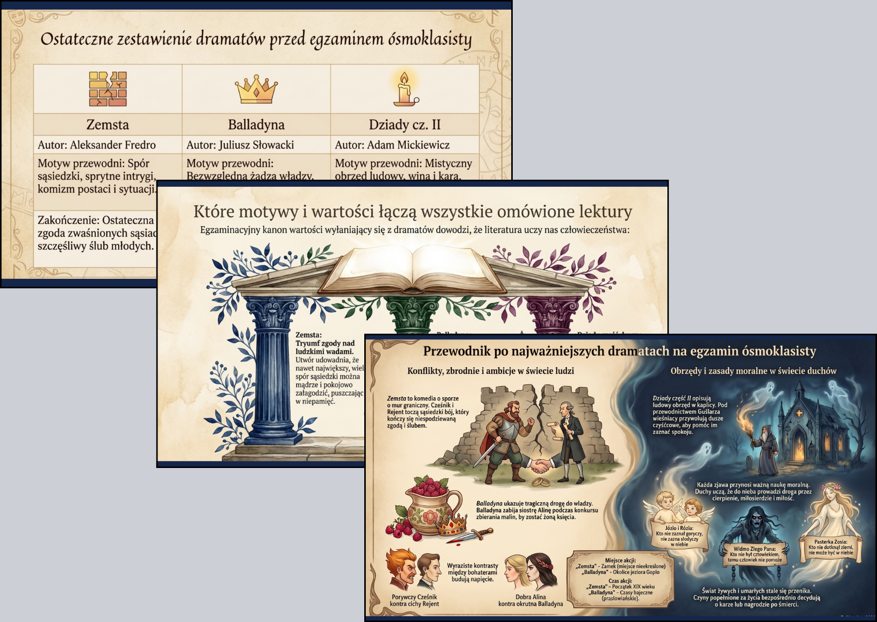 Kompleksowa powtórka przed egzaminem ósmoklasisty w jednej prezentacji! Materiał łączy najważniejsze informacje o lekturach oraz podstawy teorii literatury w przejrzystej i atrakcyjnej formie.