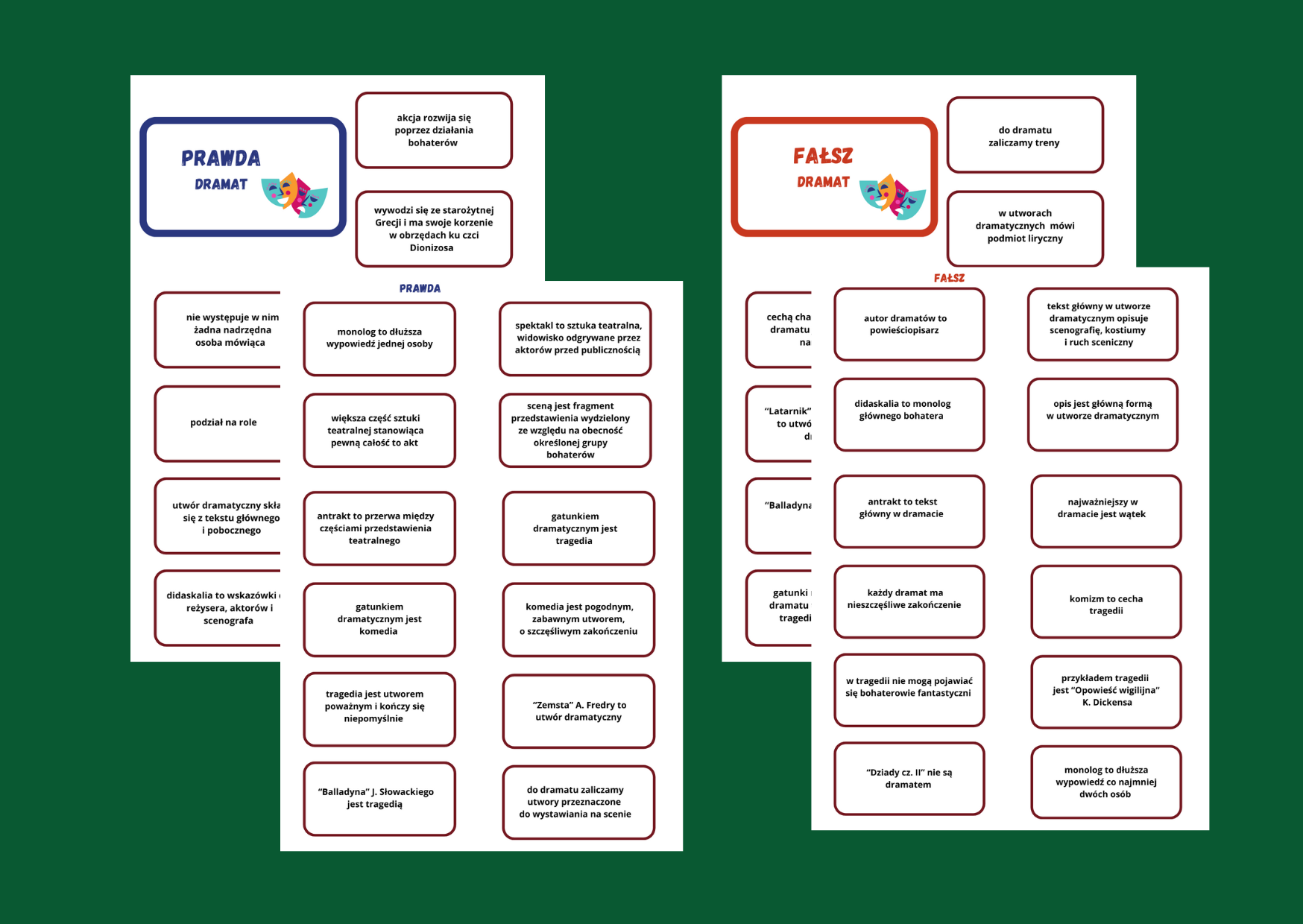 Materiał zawiera 46 fiszek dotyczących dramatu jako rodzaju literackiego ( 5 stron, w tym jedna pusta do uzupełnienia). Na fiszkach znajdują się stwierdzenia dotyczące dramatu - zadaniem uczniów jest posegregowanie ich na zdania prawdziwe i zdania fałszywe. Po wydrukowaniu warto materiał zalaminować, by posłużył dłużej. Można tez wydrukować w zmniejszonym formacie i rozdać uczniom do wklejenia w zeszycie. Na pozostałych moich aukcjach można zakupić podobne materiały dotyczące liryki i epiki oraz  różne pomoce związane z rodzajami literackimi: prezentacje, wklejki, karty pracy, układanki, puzzle, dooble, domino, gry "Ja mam..., kto ma...", sprawdzian.