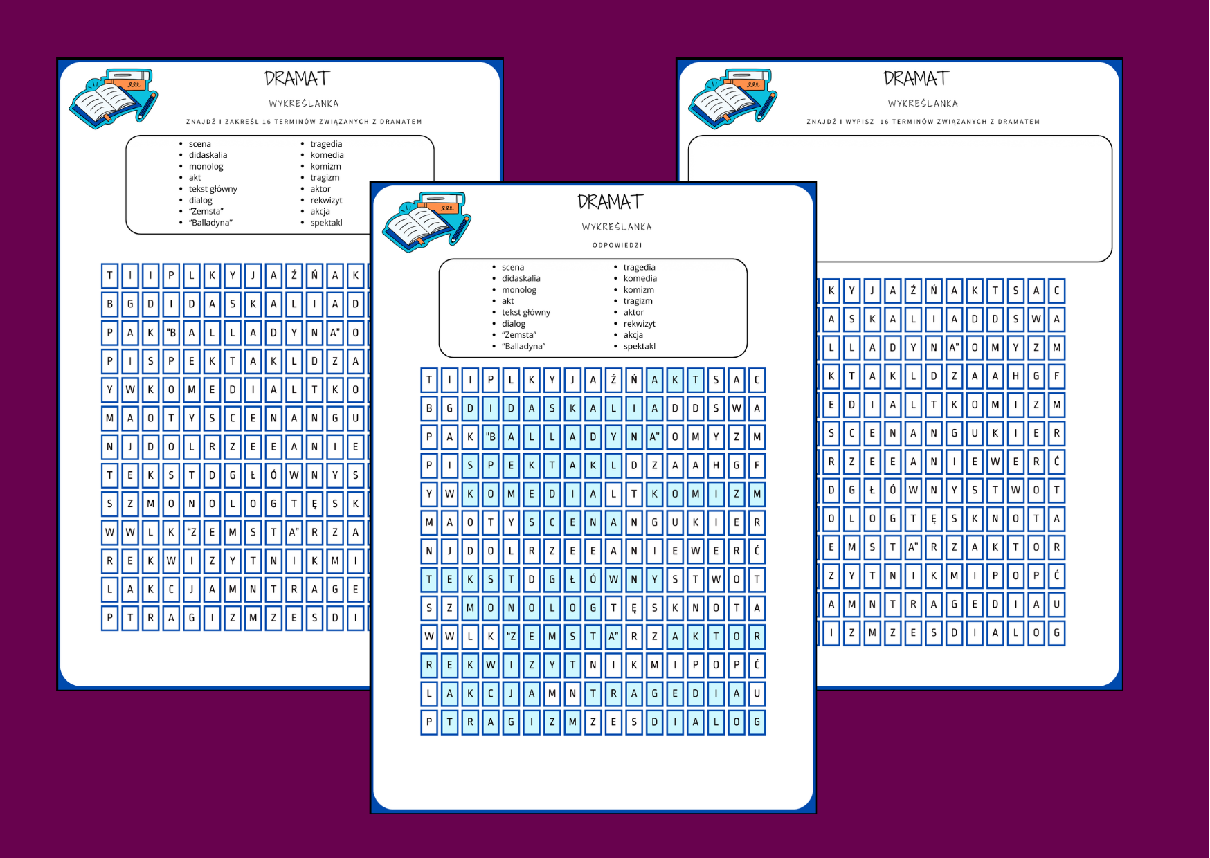 Materiał zawiera wykreślankę dotyczącą dramatu (3 wersje: z odpowiedziami, bez odpowiedzi, bez wyrazów do odnalezienia).