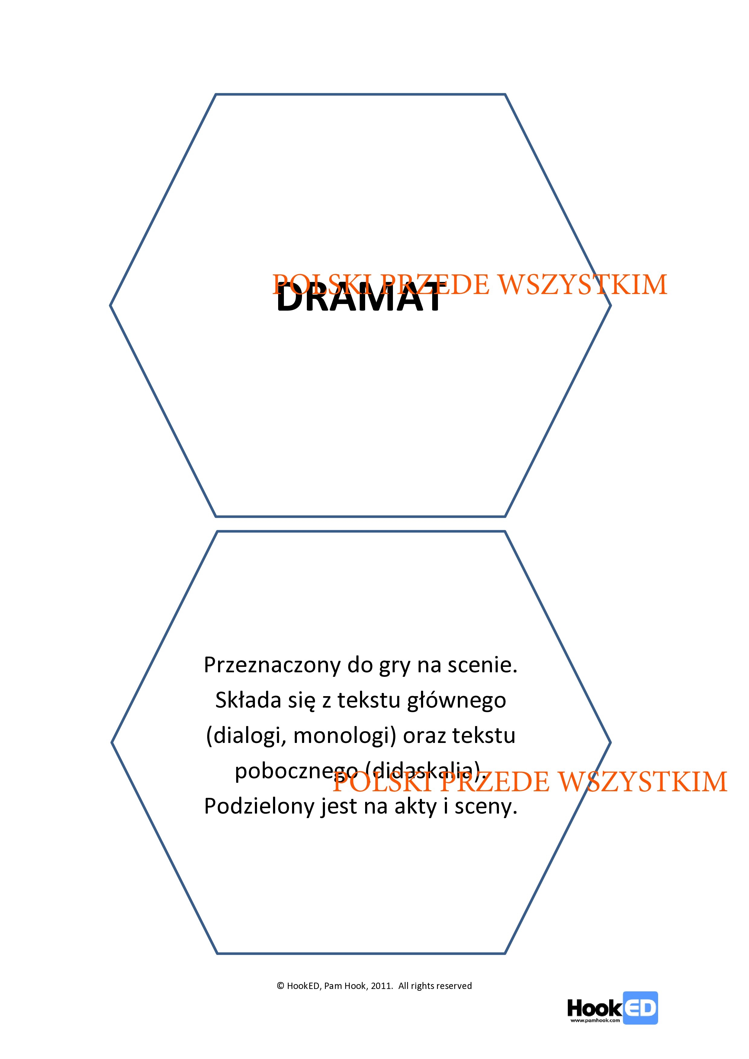 Materiał "Dramat w heksach edukacyjnych zamknięty" składa się z 79 "plastrów". Ta część poświęcona jest dramatowi. Układanka ma za zadanie, przede wszystkim, utrwalić jeden z rodzajów literackich, jakim jest dramat. Dlatego też na heksach znajdują się informacje wyjaśniające, czym jest dramat, jakie należą do niego gatunki, cechy tych gatunków, tytuły lektur, cytaty, bohaterowie oraz ikony, które są obligatoryjnym elementem znajdującym się na egzaminie ósmoklasisty. Takie "plastry miodu" świetnie nadadzą się na utrwalanie wiedzy nie tylko z rodzajów i gatunków literackich, ale także z lektur obowiązkowych. Oprócz lekcji, można wykorzystać np.: na konkursach szkolnych, podczas pracy stacjami zadaniowymi itp. Tekst zamieszczony na plastrach jest tak skonstruowany, że możemy przekazać uczniom część heksów...., nie musimy dawać ich wszystkich. To od nas zależy, jaki gatunek i które jego elementy chcemy utrwalać.