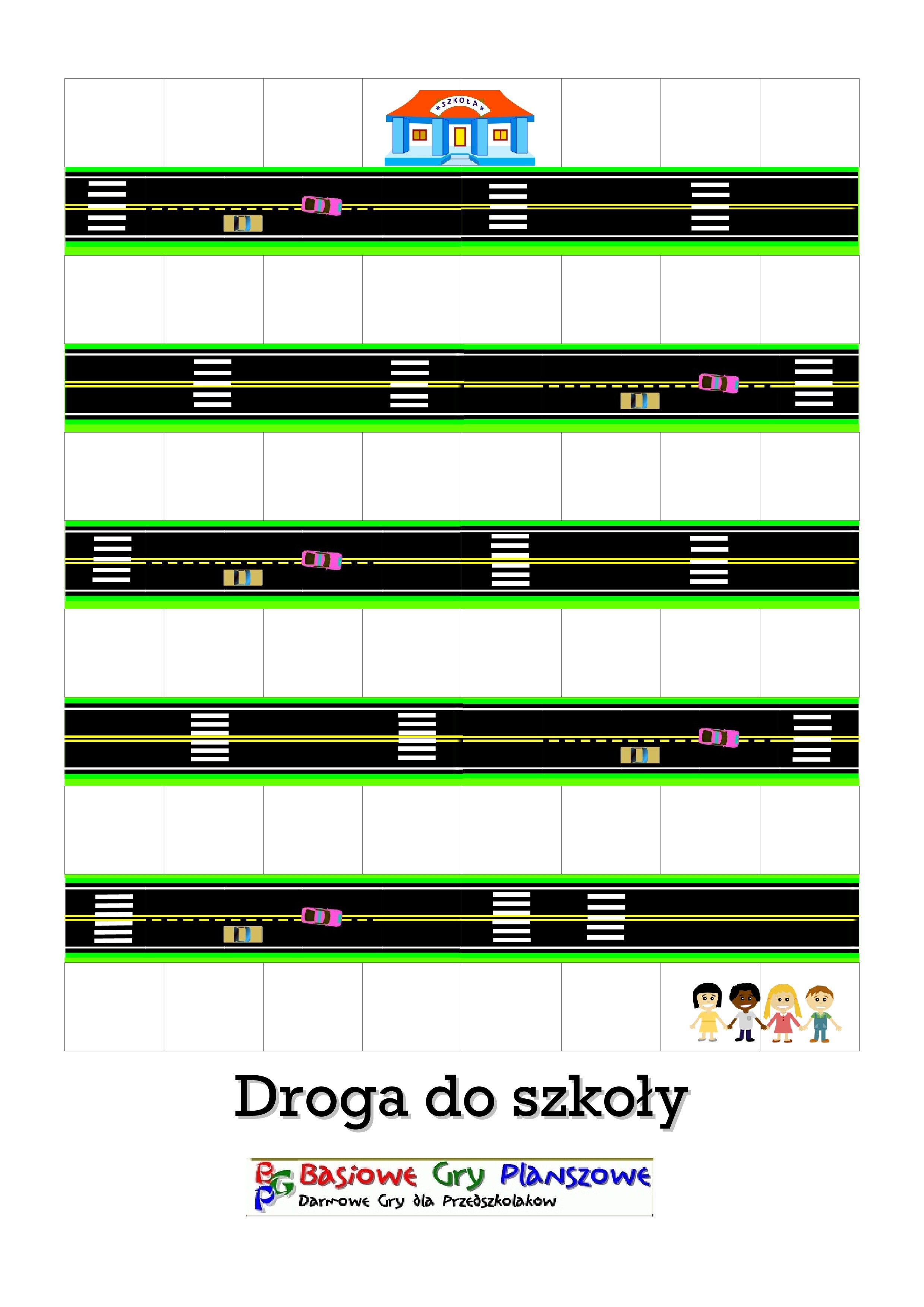 Droga do szkoły to wyścig, którego celem jest zdążenie do szkoły. W jego trakcie dzieci będą musiały przejść przez kilka ulic. Oczywiście tylko po pasach.
