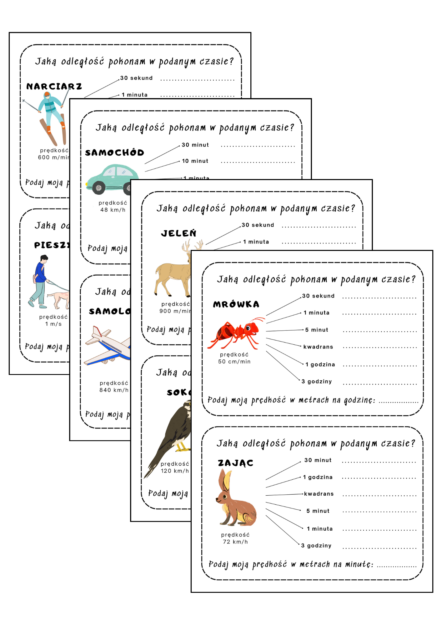 Droga, prędkość, czas - karty pracy. Jaką odległość pokonam w podanym czasie?