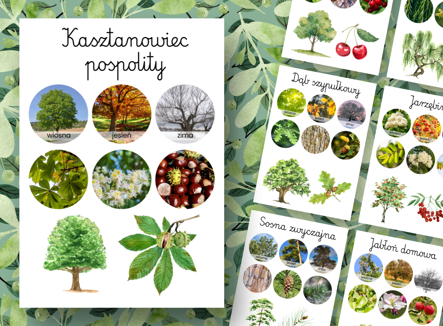 Plakaty edukacyjne prezentujące aż 17 drzew w różnych porach roku oraz dodatkowe zdjęcia przedstawiające elementy/cechy charakterystyczne dla nich.