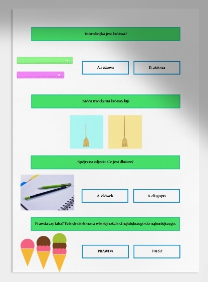 Ten materiał edukacyjny to idealna pomoc dla dzieci w wieku przedszkolnym i wczesnoszkolnym 👧👦. Poprzez ciekawe ćwiczenia dzieci uczą się porównywać przedmioty pod względem wielkości, wysokości, szerokości i długości 🧮.