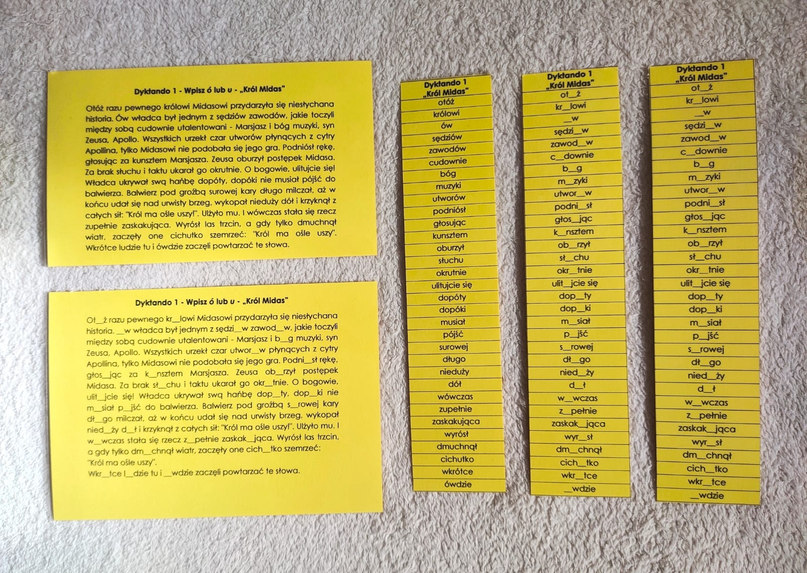 Jako sprawdzenie wiedzy rozdaję uczniom dyktando z lukami. Mogą samodzielnie sprawdzić poprawność wykonanego zadania, porównując je z gotowym (uzupełnionym) tekstem dyktanda.