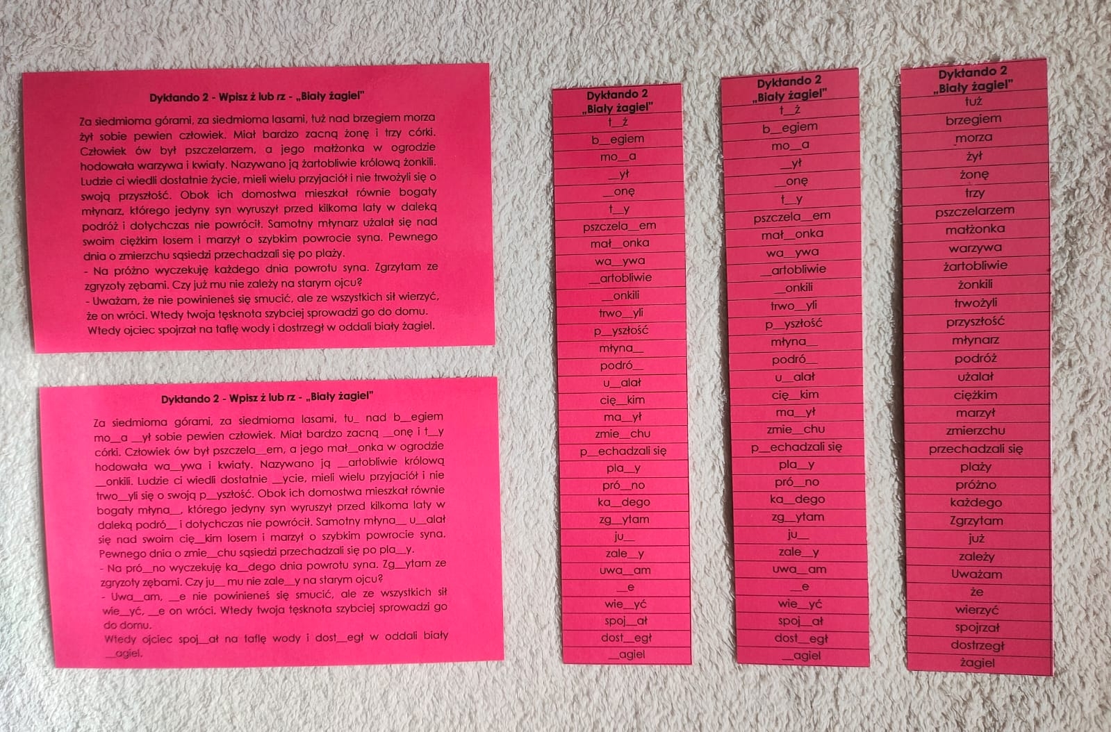 - dwie kolumny wyrazów z lukami (wszystkie wyrazy z trudnościami z dyktanda).