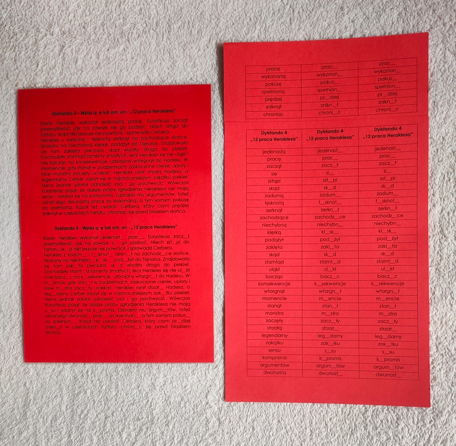 Najpierw jest tekst dyktanda uzupełniony (bez luk). Następnie tekst dyktanda z lukami. Później mamy tabelę. W tabeli są wyrazy z wybranymi z dyktanda trudnościami, kolejno: