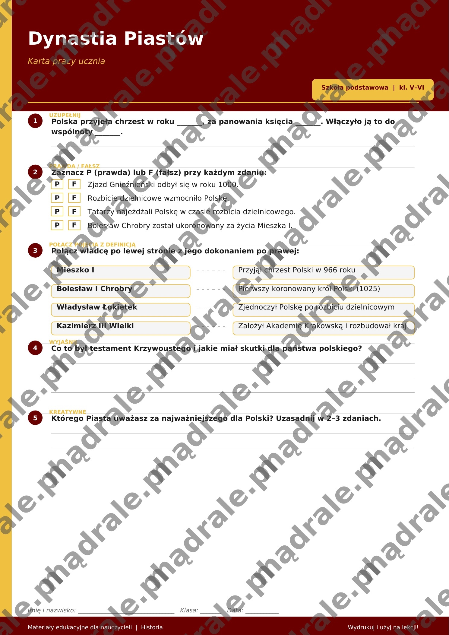 🧩 Kartę pracy z zadaniami dotyczącymi dynastii Piastów (m.in. pierwsi władcy Polski, ważne wydarzenia, rozwój państwa).