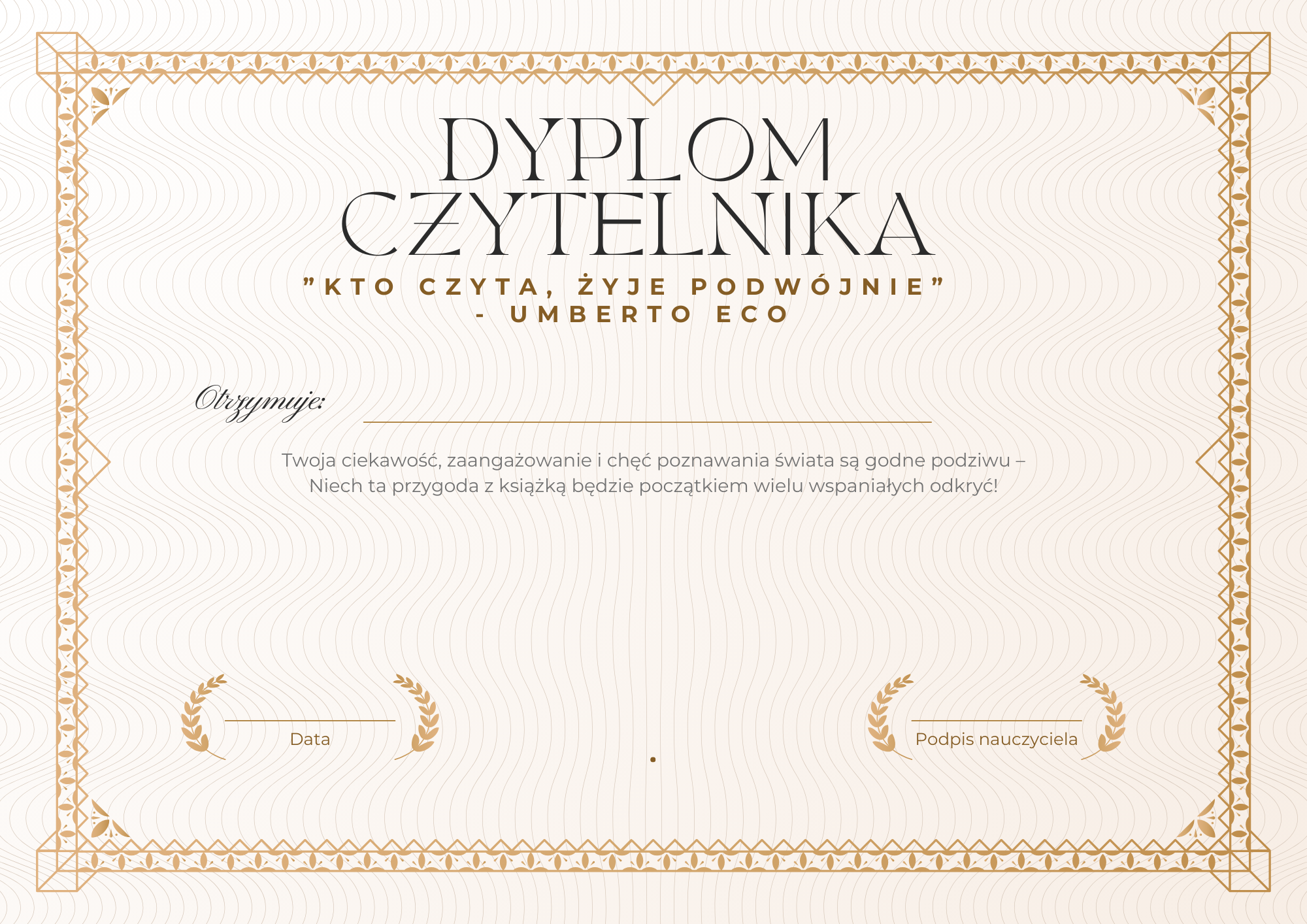 Materiał zawiera dyplom dla czytelnika z cytatem Umberto Eco "Kto czyta, żyje podwójnie". Stonowane kolory i gotowość do wydruku!