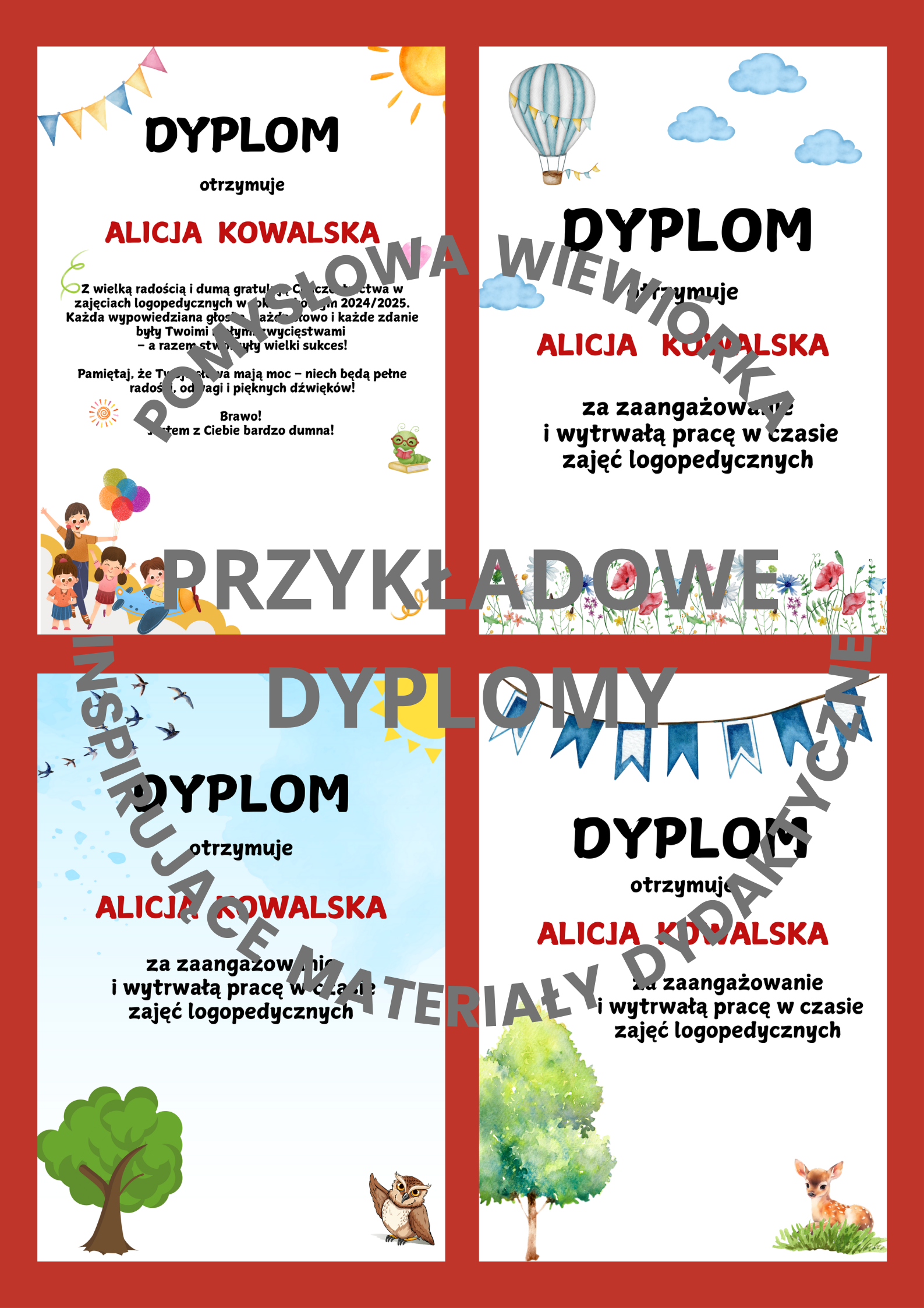 Każdy mały krok dziecka to wielki powód do dumy – zwłaszcza ten, który wymagał czasu, wytrwałości i wsparcia. Ten zestaw dyplomów powstał, by uhonorować dzieci uczestniczące w zajęciach logopedycznych i rewalidacyjnych – z wdzięcznością za ich zaangażowanie, cierpliwość i codzienną pracę.