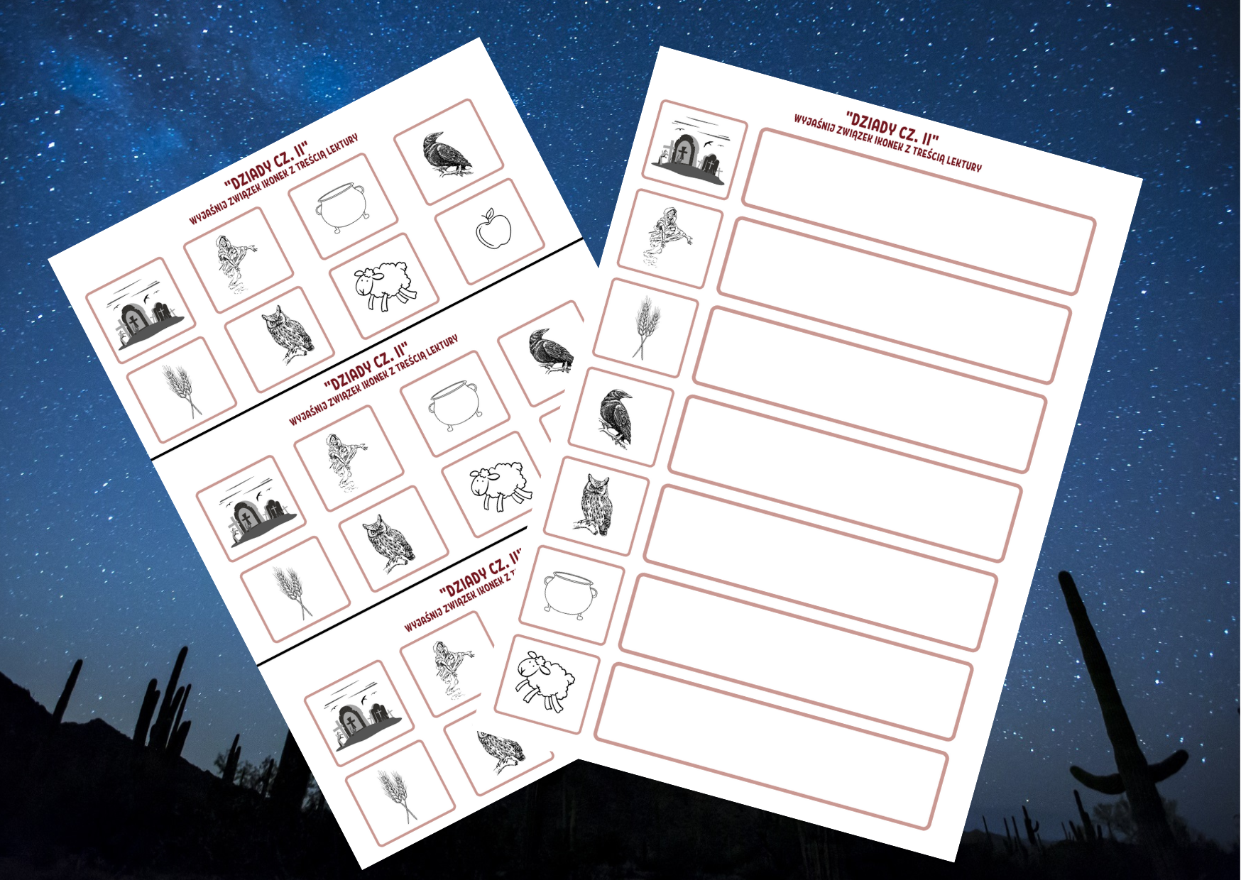 Zestaw „DZIADY cz. II” składa się z karty pracy oraz karty z 3 wklejkami (obie karty pdf w formacie A4 oraz png), które zawierają ikonki dotyczące treści lektury.