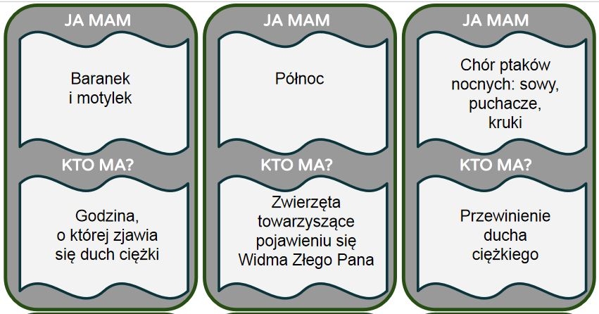 Materiał „Dziady cz.II ” – „Ja mam…” „Kto ma?” zawiera 24 karty do gry „Ja mam… Kto ma…” ułożonej do treści „Dziady cz. II”. Zabawa jest atrakcyjnym sposobem na wprowadzenie bądź utrwalenie zagadnień związanych z tą lekturą. Oprócz 24 pełnych kart jest też zestaw 8 pustych ramek, by można było dopasować grę do liczebności większej klasy. Zasady gry: Uczestnicy siadają (stoją) w kręgu. Każde dziecko otrzymuje jedną kartę. Następnie wybieramy osobę, która zacznie odczytywać informacje ze swojej karty. Np. Uczeń 1 odczytuje „Ja mam: Start. Kto ma: Miejsce rozgrywania się obrzędu? Pozostali uczniowie muszą być czujni, gdyż teraz musi odezwać się osoba, która ma „Przycmentarna kaplica za wsią” na swojej karcie (taką opcję ma tylko Uczeń 2). Osoba, która ma taki zapis na swojej karcie odczytuje odpowiedź i kolejne pytanie: „Osoba prowadząca obrzęd”. Następnie Uczeń 3, który ma na karcie odpowiedź na zadane pytanie, odczytuje ją i zadaje pytanie.
