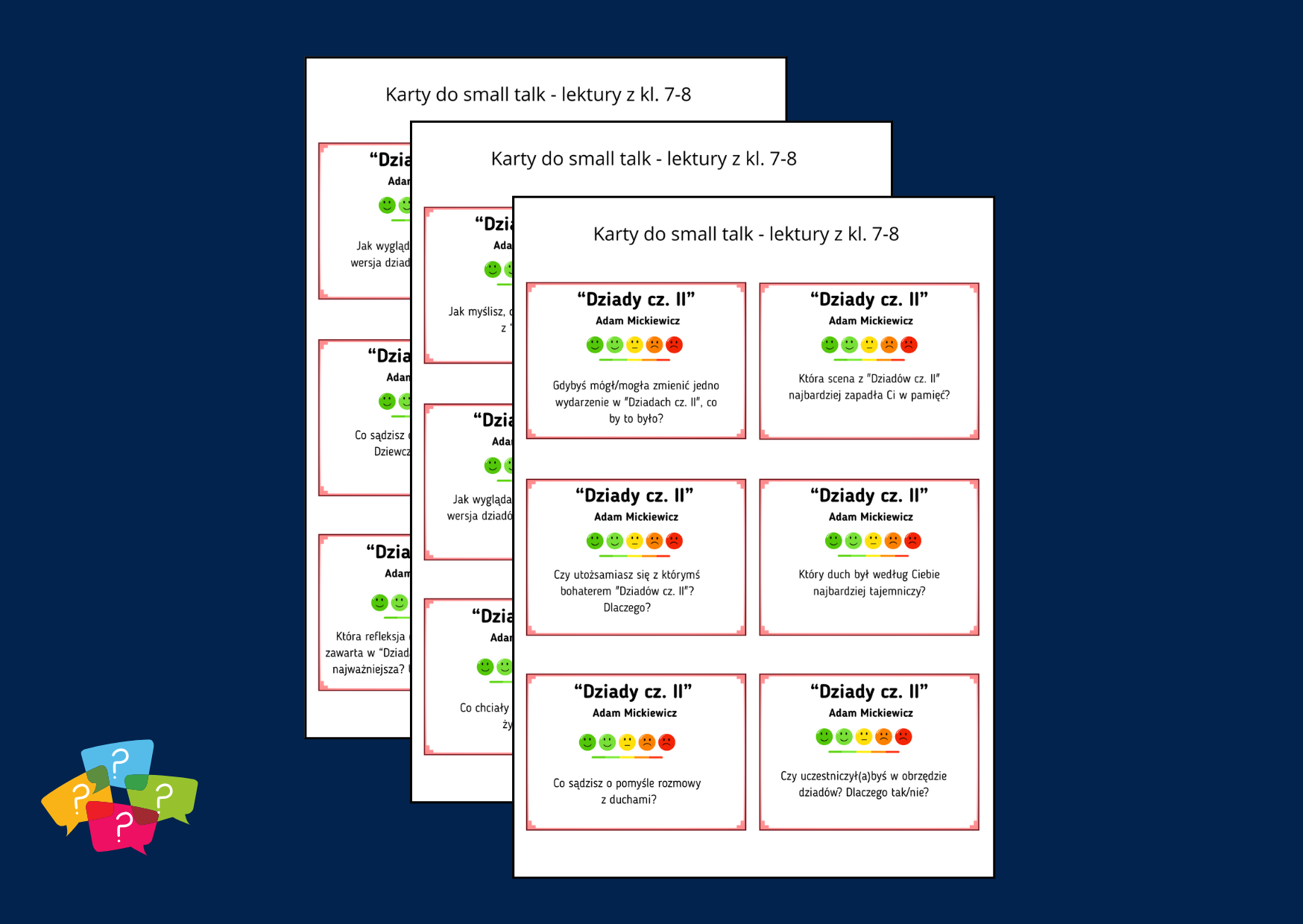 18 pytań typu „Karty small talk” do II cz. „Dziadów”. Takie pytania mają charakter swobodny, zachęcają do refleksji, rozmowy i dzielenia się opinią, a nie tylko sprawdzają wiedzę. Mogą być wykorzystywane na lekcjach jako forma integracji z lekturą lub podczas luźniejszych rozmów literackich. Dzięki nim można ćwiczyć wypowiedź argumentacyjną. Zasady: uczeń losuje kartę i odpowiada na pytanie (lub wszyscy uczniowie odpowiadają na to samo pytanie).