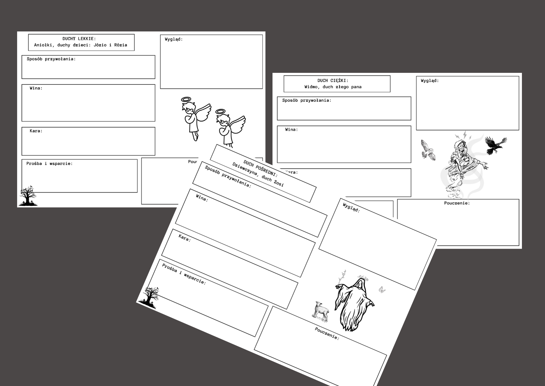Zestaw zawiera 3 karty pracy do uzupełnienia  dotyczące duchów: kategoria, wygląd, sposób przywołania, wina i kara, prośba i wsparcie, pouczenie. Na pozostałych moich aukcjach zakupić można inne materiały dotyczące II części "Dziadów": trimino, grę "5 sekund", grę "Ja mam..., kto ma...", grę "Ułóż pytanie, odpowiedź już masz", ikonki do zadań redakcyjnych, krzyżówkę i wykreślanki, grę "5 sekund" i "Ja mam..., kto ma..." dotyczącą życia i twórczości Adama Mickiewicza. Grafiki wykorzystane w kartach pracy pochodzą z aplikacji Canva.