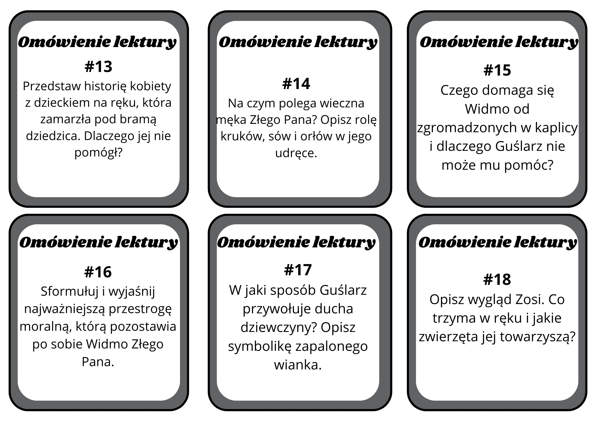 Atmosfera zamiast cyferek: Tutaj nie ma pytań o rok wydania czy dokładną godzinę obrzędu. Pytamy o to, co gnębi dusze: o winę, karę i o to, dlaczego Józio i Rózia nie mogą pójść do nieba. To uderza w emocje, a nie w pamięć mechaniczną!