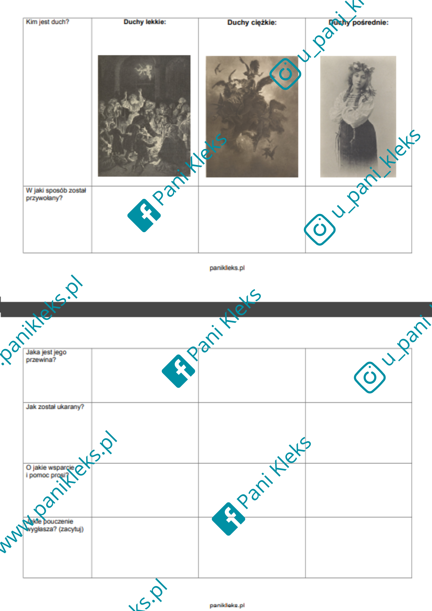 Tabela do zestawienia informacji na temat duchów (sposób przywołania, wina i kara, oczekiwana pomoc, pouczenie). Tabela zawiera archiwalne ilustracje Cz. B. Jankowskiego oraz fotografię Wydawnictwa Salonu Malarzy Polskich, dostępne w domenie publicznej.